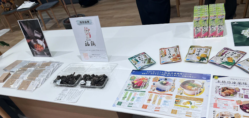 会場の一角には参加事業者の商品を展示・紹介するコーナーも設けられ、訪れた参加者同士が自然に足を止め、商品の背景や開発ストーリーに耳を傾けながら、互いの取り組みに興味を寄せる様子が見られました。